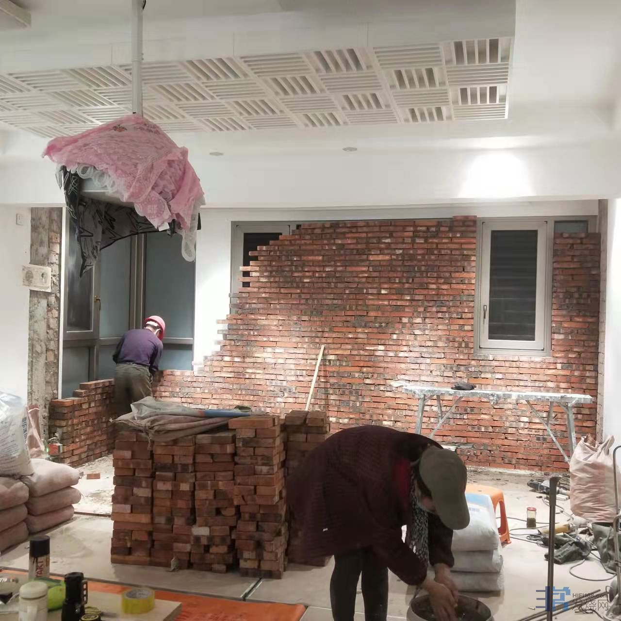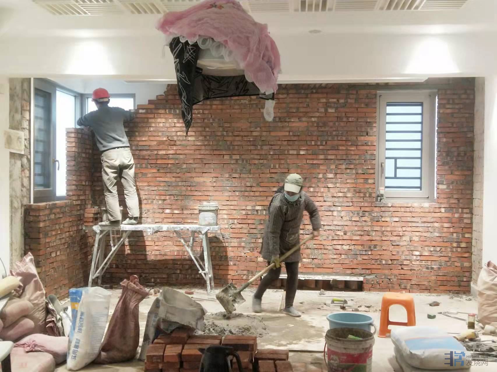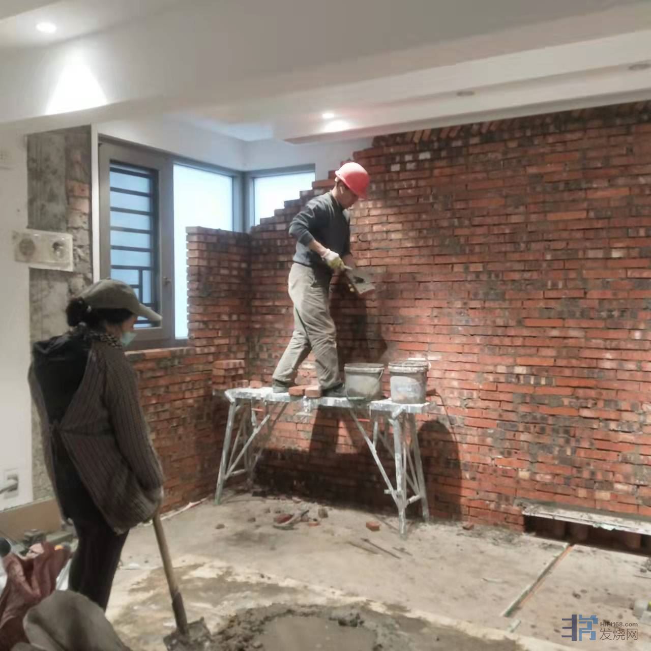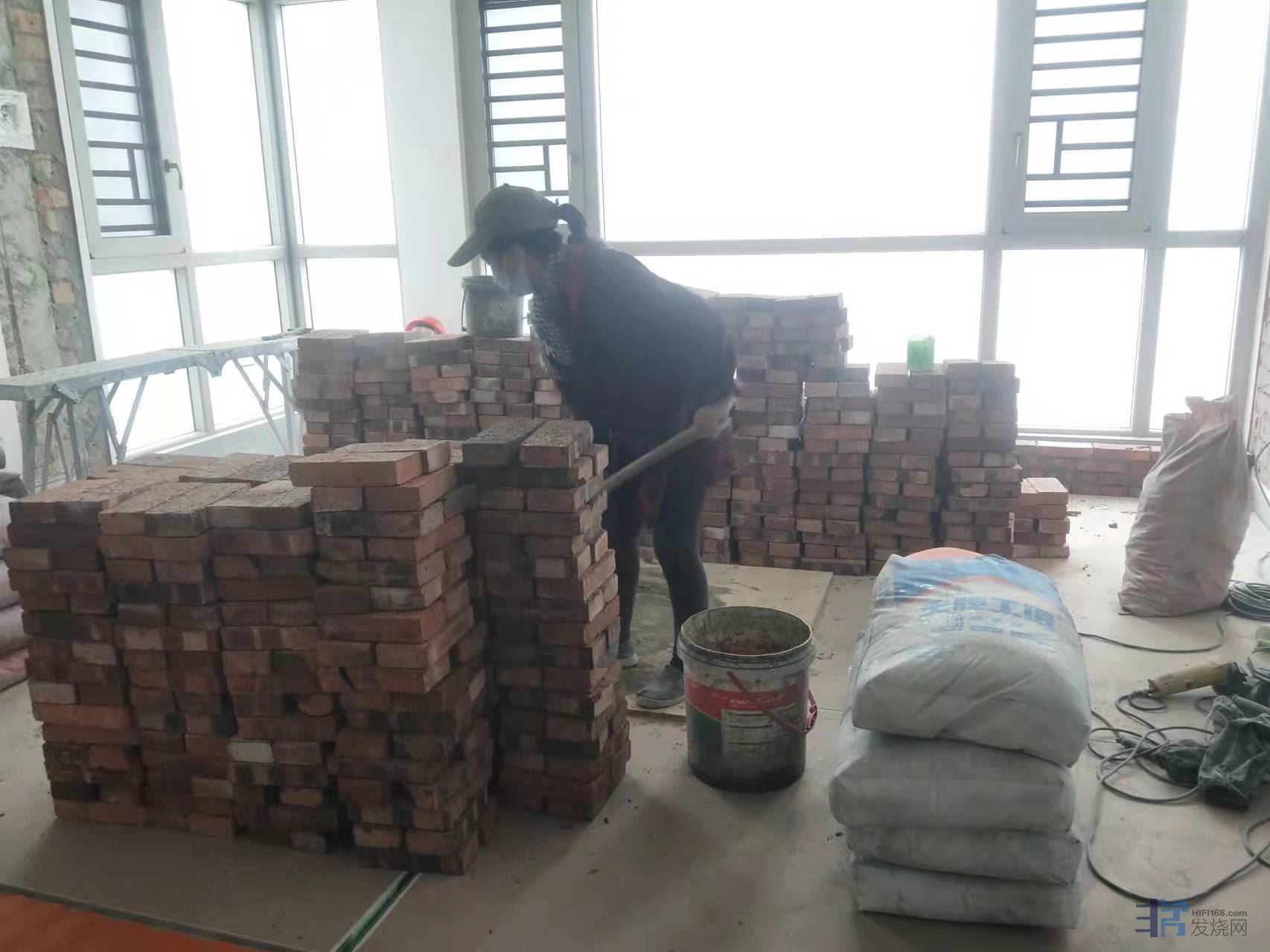 第三步,也是最重要的一步,砖墙伺候!在里面砌砖砖墙,把落地窗封起来,包括相应的墙面抹灰、硅藻泥、踢脚线等等。