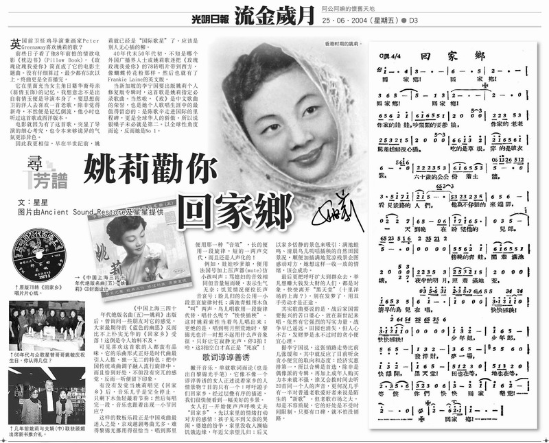 我非常喜爱姚莉的歌曲。有人说:“她的歌唱从不曾经过老师的指教”。但她总是唱得字正腔圆,赏心悦耳。(略带上海口音的国语)