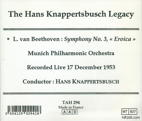“怪物”Hans Knappertsbusch(1888-1965)的Beethoven交响乐没录全,完整的录音只有2、3、5、7、8,此外据说还有些许其他的录音片段,不过似乎在CD上看不到踪影。第三号“英雄”Kna留下了四次录音:
