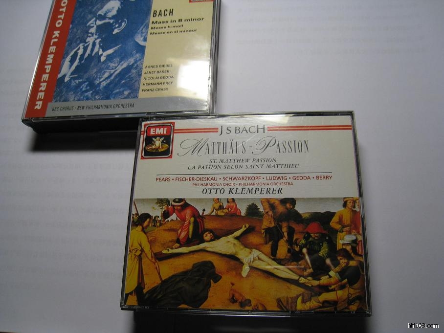 开始听巴赫,最喜欢的就是他的马太受难曲。一位朋友说如果到一个荒岛上度过余生只带两套唱片,一套必须是马太受难曲——好歹有3cd.玩笑了。要表达的意思就是马太受难曲内容的气象万千。相比著名的 karl richter版本,klemperer的版本沉重,凝滞。但是这正是klemperer指挥吸引人的地方,渐渐就会融入其中,觉得这才是最耐听的版本,可以带到荒岛上度过余生的版本。曾经在国外购片是碰到一位大学音乐老教授。他看过诸多大师的指挥如karajan, bernstein等等,说到karajan,他的评价 是karajan的指挥姿态永远完美,bernstein的指挥投入状态让他充满“诧异”。而说到klemperer指挥,他一下子就失去了刚刚诙谐点评的状态,一下子认真起来。后来他又讲到了一个klemperer的晚年指挥由一人推椅子出场,开始指挥,大师摆弄几下以后,椅子后面站着的人有时会上前去拍下他的肩膀,可能是时间一长,老人家自己睡着了。也许大师的凝重感由此而来吧。
