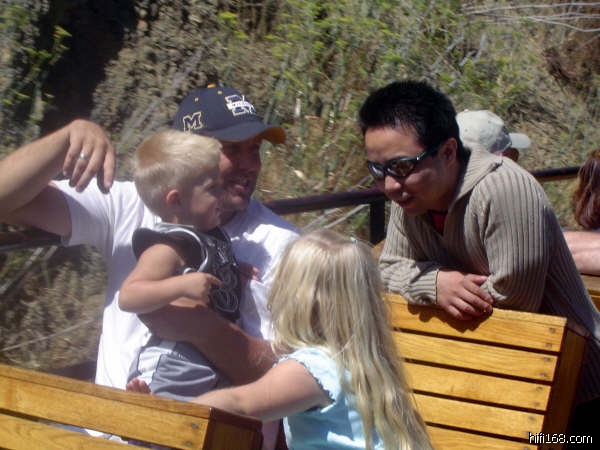 送我们去的班车司机是位老人,絮絮叨叨的介绍了蒸汽机车保留下来的历史。听了介绍,倒是颇有感触,86年的时候就有一批志愿者,从恢复,维修,建造一直到开通至今,付出了很多很多。包括来往班车,导游员,列车司机、检票员都是志愿者,而他们本身都有自己的一份职业。这么一群热爱旧式火车的人使得在距离大都市旧金山一小时多车程的地方仍然能感受到20,30 年代的气味。车票无价,自己认购,作为对铁路维修的微薄补贴。火车开动之后,速度不快不慢,徐徐驶进山谷。带我进入闲散状态的则是多数游人的笑容,每个人似乎都很享受这段时光。车上有一对典型的美国夫妇带着可爱的三个孩子,两个女孩一个小男孩。恰逢小男孩两岁的生日和小女孩六岁生日,可爱的小男孩刚刚学会说话,言语表达还不确切。我问他:你早饭吃了什么东西啊?金发小东西看着我认真的回答:“早饭”,让四周的人们忍俊不已。再问:“中午想吃什么呀?”答:“礼物!”边上的妈妈解释道:“他就知道要礼物。” 游人中有一位大胡子老人,坐上返程的班车时候,他主动和司机搭话。告诉司机他是一个刚退休的巴士司机,很想为这个火车做些什么,打听到哪里去报名作志愿者等等。在我看来,他已有些行动不便,可是难得的是这份心意,大约在美国这也不算难得了。