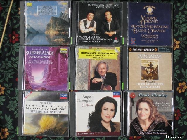 八张2.99美元的CD。我记得革命领袖老严对弗莱明的《最后四首歌》赞不绝口,看来不只是因为他那点老牛吃嫩草的坏心眼,唱得真不错。霍老的拉三,因为前段时间看到168的人猛夸RCA镭射版的CD,拿来一张听听。老范,你该知道画中《唐吉珂德》里面的大提琴是谁锯的吧。这个版的《天方夜谭》评价那么高,一直想看看庐山真面目,可惜不太和俺口味。左下角的尼尔森是1.99美元的,占满空间。