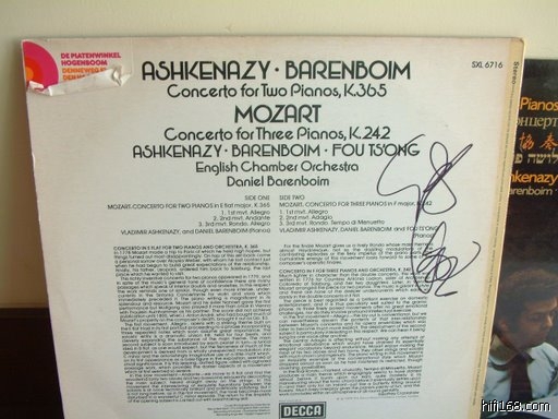 演出后,我第一次在后台等候演奏家,期待见偶像一面,然后期望他在自己34年前录制的黑胶唱片上签字.突然发觉许多人手里拿着<傅雷家书>等签名,这让我感觉真的很难过,很不舒服.记得傅老谈起过傅雷家书,说很少看,因为一看就情绪大动,久久不能平静, 这对于一个琴者来说是很糟糕的. 我想傅老也不愿意提及从前的事情. 所以看见有人拿着这曾经记录这些辛酸往事的书来求签名,心里很想阻止他们,希望他们不要带给老人哪怕那一丝的不快。我想傅老看见我带去黑胶唱片一定会很高兴,34年前和两大泰斗一起合作的莫扎特,唱片封套上的傅聪一手托腮,和两位好友一起考虑如何协作弹好K242号作品,这可是他颠峰之作啊. 果然,当傅老慢慢走出后台的时候看见我举起的唱片眼睛一亮,当我要求签名的时候,他看着那几张唱片说,“ 这些都是你哪里找来得,很难得的呀.”我激动的几乎说不出话. 原来脑子里面傅雷笔下的那个年轻人,而今已经年逾古稀,看着傅老沧桑的脸,最后由衷的说了一句,谢谢傅老师,祝傅老师健康!