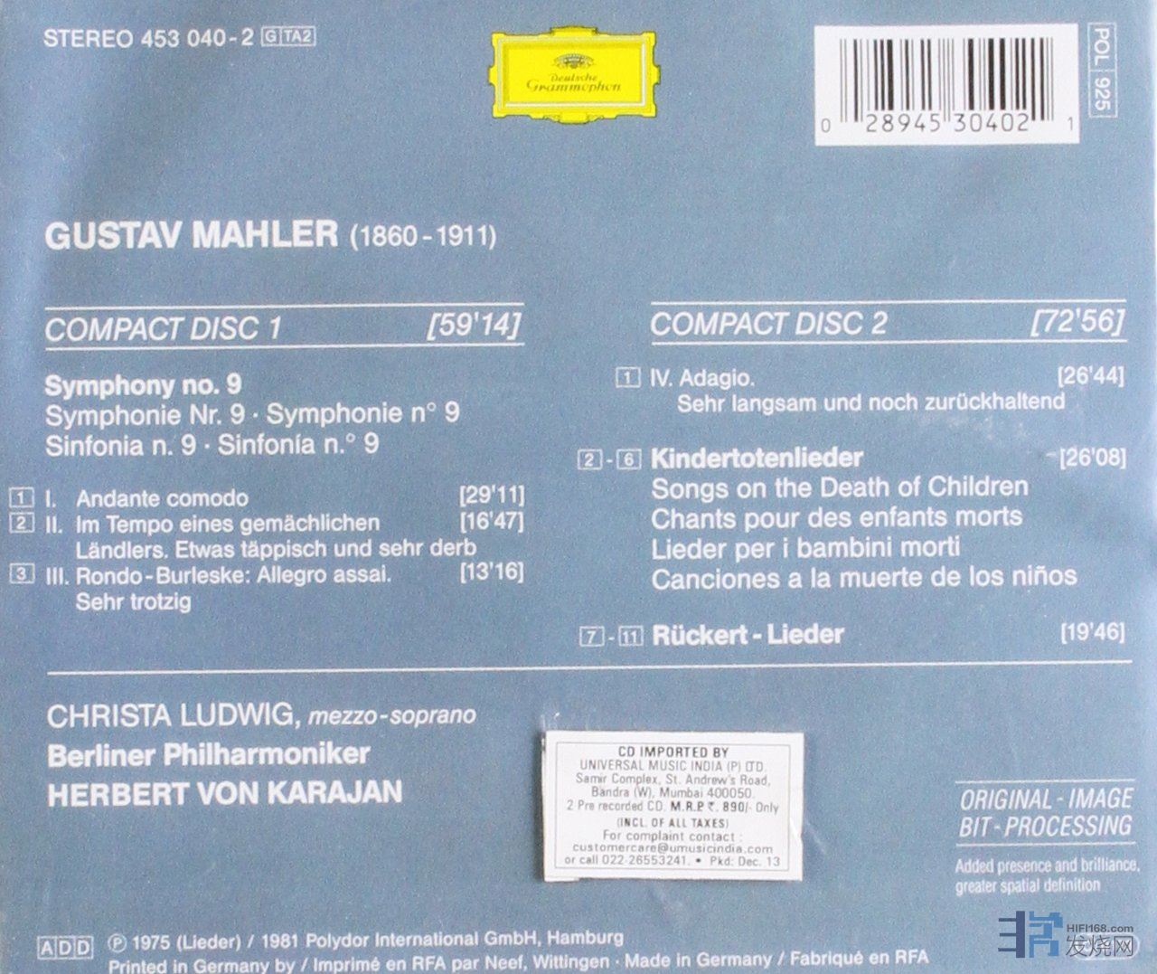 搭配的亡儿之歌,1967年霍恩斯坦指挥苏格兰国家交响乐团演出,JANET BAKER演唱,完全配得上第九交响曲的水准,比KARAJAN的小双张强多了。