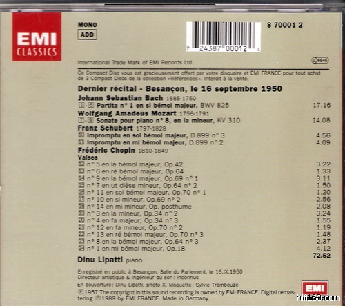 李帕蒂的天鹅之歌50年9月16号贝桑松音乐会大家都再熟悉不过了,EMI的参考系列也是不二之选;我以前也提过参考系列有两个版本,一个是编号CDH 5651662 的国际版,还有一个是编号8700012的法版赠碟,两者应该是一样的;结果没想到这两套录音居然是不同时间的后期制作! 而且录音差别还不小!!!