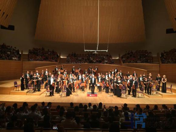 一个小插曲,在观众的热烈掌声中,指挥台边缘贴的上交的Logo,突然倒了下来,大家哄堂大笑,像是在说人家在客场把你主场的牌子给砸了。