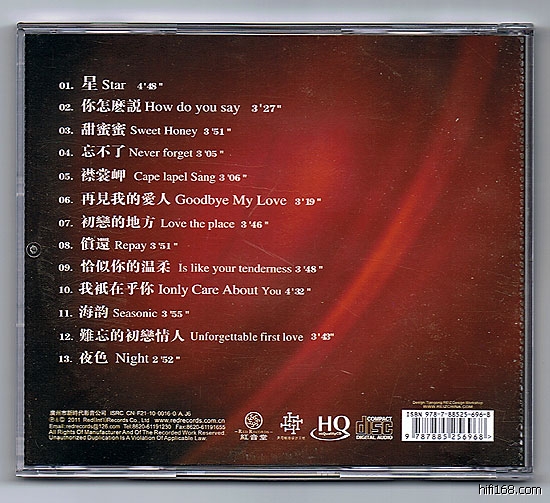 这张唱片可听性非常高,旋律大家都非常熟悉,一共选择了邓丽君的13首脍炙人口的歌曲,录音也非常传神,唱片后期由日本JVC K2HD中心处理,HDCD格式出版。
