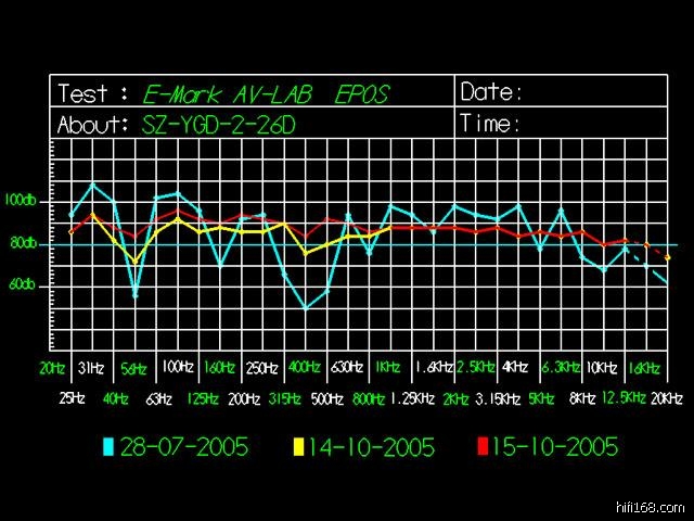 蓝色是未装修时的频率响应,黄色是装修后的,红色是用均衡器调整后的。