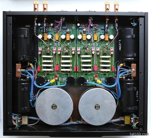 内部大图, 可见完全的双单声道独立设计, 无论电源部分还是功率放大部分, 完全可以认为是把双单声道做在了一个机壳内, 该机MBL使用了大量的胆机的搭棚工艺而不是别的器材使用的简单的线路板设计, 为了靓声MBL不惜成本的用了大量的高纯度无氧铜线在机子内部.