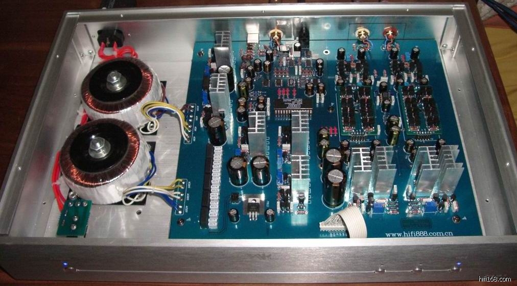 全机共采用138颗进口名牌三极管。其中电流传输模块和缓冲部分共96颗,配对精度在千分之五以下,配对成功率不到百分之二十,成本极高,(图2为电流传输模块)。7组由分立件制作的并联电源稳压分别对数字和电流传输模块等供电。PMD100数字滤波芯片,DRI9001数字接收芯片,PCM1702解码芯片。(图3为并联电源稳压。)