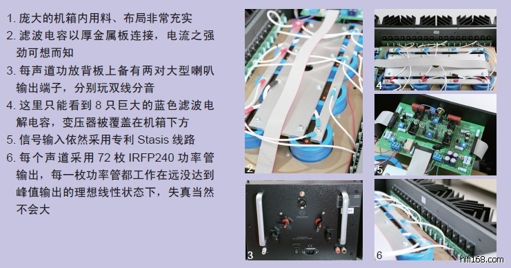 XA200.5的内部构造十分简洁,一共两级放大电路,再没有其他多余部分。为了给数十个MOSFET功率晶体管提供持续稳定的电源,8枚巨大的电容用金属板连接在一起,而非通常细小的导线,可以想象瞬间提供的电流是多么巨大。密密麻麻的MOSFET晶体管紧贴散热板分布在机箱两侧。按厂方归纳的Pass Labs精髓来说就是:极简单的电路,尽量少的元件,以及超大的干净电源。XA200.5采用单端纯A类放大,8欧负载时持续输出200瓦无交越失真的信号功率,4欧姆负载时候可稳稳地达到400瓦,瞬间可输出高达48安培的电流,动态达155dB,并且能提供持续而稳定的功率输出,相信没有什么音箱是它搞不定的。