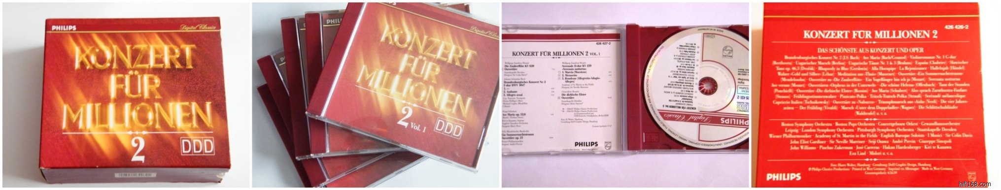 (6)百万大众喜欢的名曲集(第一辑),柏林爱乐、波士顿通俗等乐团、马里纳、科林•戴维斯等指挥、阿劳、祖克曼等独奏家带来的名曲集(鲁斯兰与柳德米拉、乡村骑士、费加罗的婚礼、伏尔塔瓦河、小步舞曲等),全部经典演绎,5CD西德PDO满银圈,4张01版,3张播放浅痕,其余近新,280