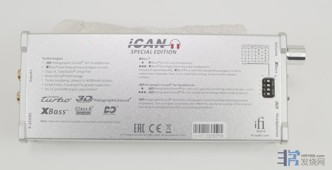 机身的底部密密麻麻的都是文字,介绍了iFi micro iCAN SE的主要性能,以及Bass低音与3D HolographSound立体声校准系统的说明与使用方法。