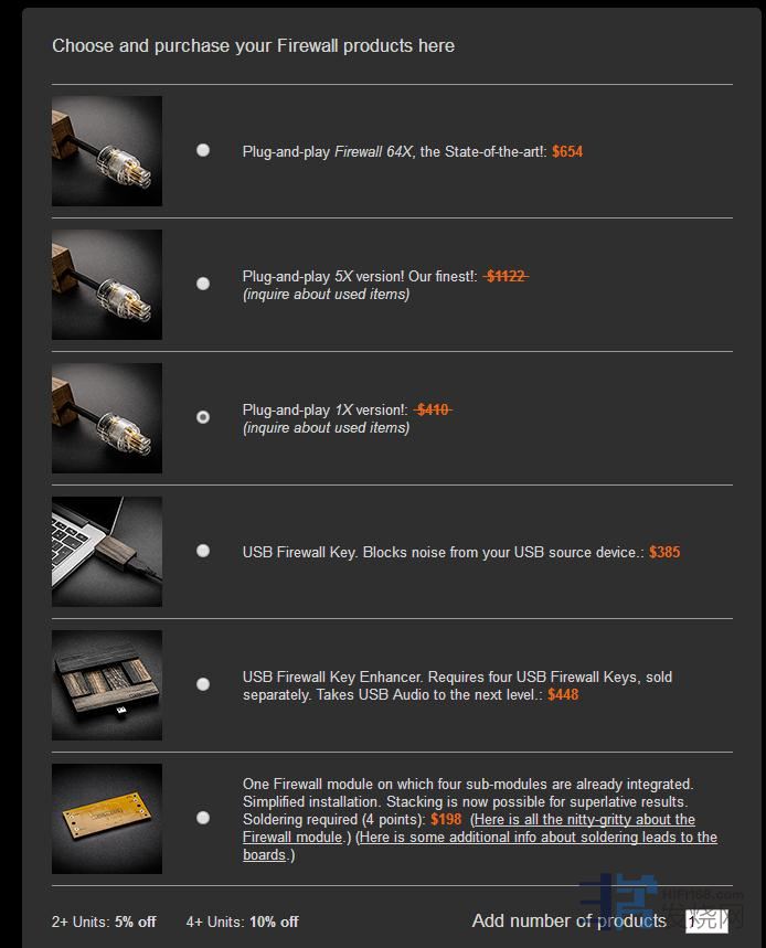 另外关于防火墙的使用,防火墙可以叠加使用,1x64x可以直接串联使用,串联多个效果会更佳。厂放建议,每个hifi设备后面都应该使用防火墙,而并不推荐在电源排插或者电源处理器上使用,因为厂家设计的原理就是越靠近设备电源的输出端效果越明显。所以厂家也推出DIY配件,动手能力强的玩家可以直接把模块安装到机器内部。