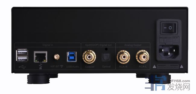 从左到右分别是:USB*2,每个最大8TB,每个分区最大2TB、 网络接口、基于FPGA的HIFI蓝牙接口、基于FPGA的USB高性能声卡以及界面接口、同轴光纤输出、可带音量控制的RCA输出以及电源开关及保险丝座。