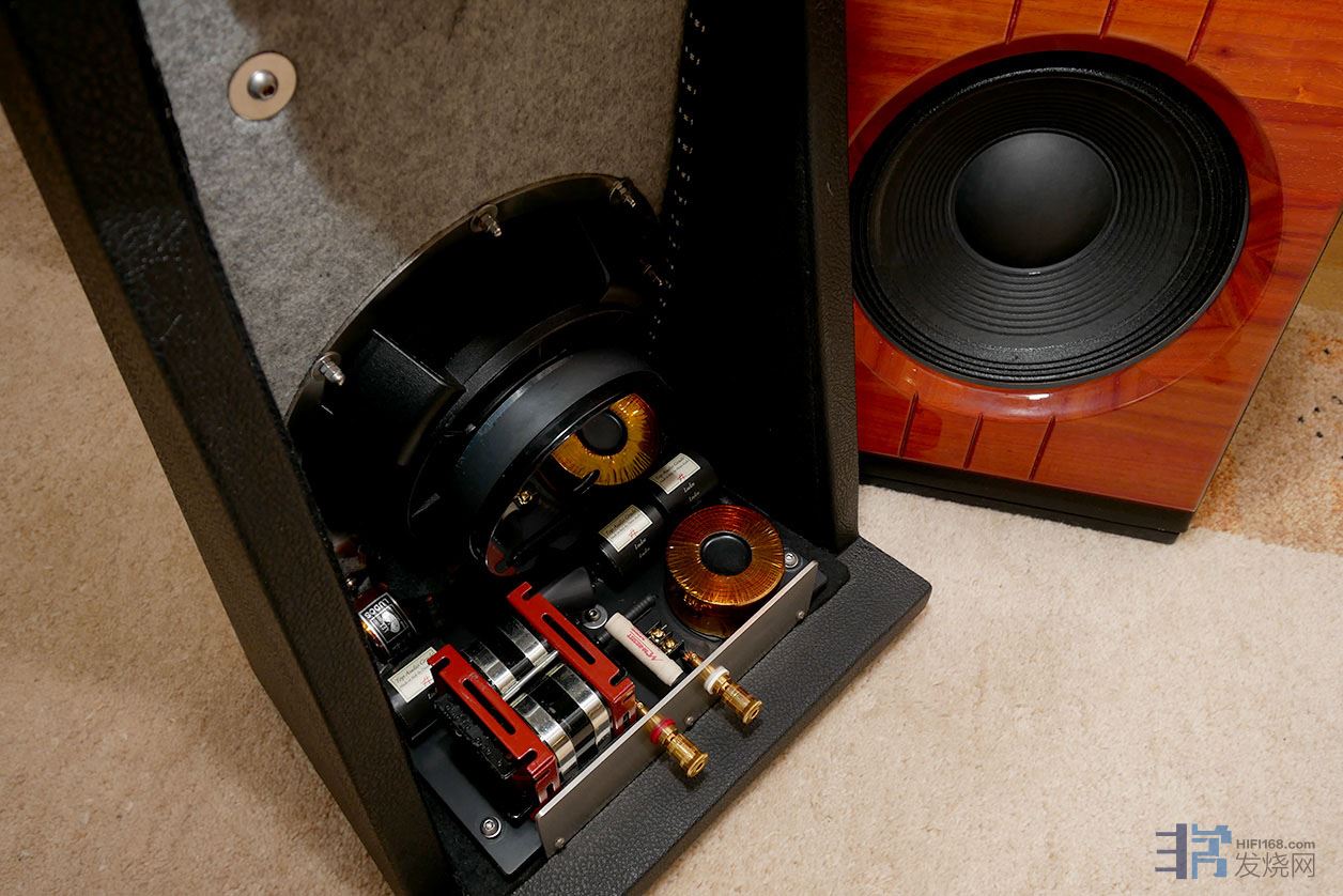 我们在音箱的背部可以看到Ludos的分频器底座是由10毫米厚的特制PVC制成,并由数控机床加工。此外,我们还可以看到安装在上面的分频器用料,肉眼所及Audin Cap,Mundorf 金银系列电容器和Mundorf 超粗低阻的方形线芯,OFC铜箔线圈等等贵价元件。光是那个电感器,就相当于一个100w AB类功放中标准变压器的大小了。在电感器旁边,我们还可以看到固定在内的一个可替换的Mundorf电阻器。Ludos所有的元件通过听音测试进行精心挑选,并且经过介电树脂处理达到军用标准(旗舰等更是采用银线圈银线等等)。分频器的元件之间通过直接连接,有效消除了传统电路板的接触电阻,以便更好地传输信号。