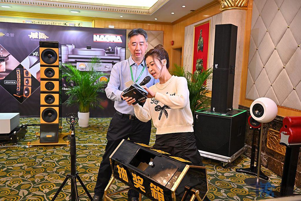 2024年11月23日《2024非常发烧网网友大聚会》。一年一度非常发烧网(HIFI 168.com网)网友大聚会,我带着广州市两位大学生发烧友来参加大聚会。大聚会在《东方宾馆》8楼大展厅举行,这次聚会由HIFI 168.com论坛四大版主组织(至今已组织十几个年头)这种组织能力不简单,要点赞。大聚会当然有版主分别主持精彩节目。这次聚会所用场地器材同样是感谢威傲音响代理商。这次播放的软件音乐非常动听靓声,因为都是首版LP软件首版C D。通过版主们的辛勤筹备,聚会活动原本在7.30分开始,但是还没到6点钟,就有来自全国各地的音乐爱好者,发烧友早早就赶到现场排队入场。我6点到时坐位上已满无虚席。这次聚会人气旺盛,烧友积极参与,令音乐分享会热闹非凡。音响音乐发烧友最喜欢的是有个大场地加上顶级音响相聚一堂进行大欣赏,利用音响和音乐这个桥梁,互相交流,进一步提高音响音乐的知识水平,惬意做着细品音乐一晚。节目中欣赏音乐分别由三位版主eric版主,Willson 版主,Dr kuang邝版主分别主持各自精彩的音乐软件分享,音乐内容丰富,精选曲目非常生动。威傲音响代理的顶级器材组合大箱让大家听到中音丰润无敌,动态和气势凌励,听到音乐赏心悦目。现场有歌手到场唱歌,听CD后对比真人唱几首,各位听后都拍手叫好。这是一个幸运和难得的聚会。可见这是中国烧友的福气和骄傲。           Willson 版主和Dr kuang邝版主KEN 版主分别分享经典音乐软件及不同录音载体的版本音乐软件,两位分享幽默风趣又搞笑,经典音乐主要经过人一首一首的分享,更令人细心听,是特别的生动。现场有抽奖互动,论坛E版主送唱片并抽奖,这种论坛聚会欣赏让人敬佩。还有其他商家及唱片商,个人提供的奖品品种相当多。这次聚会活动奖品较多大部分到场的乐友烧友基本都有份。最后提倡这种聚会要积极参与,积极棒场。今晚让音响音乐发烧友过着一个有趣的音乐分享聚会。压轴嘉宾隆重岀场,有请香港《音响技术》总编大草与钱**给烧友分享经典发烧唱片。大草分享,首首经典,非常动听,谢谢。