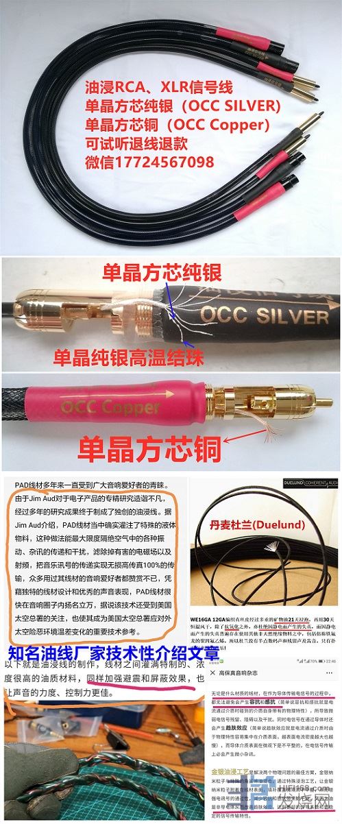 个人DIY作品:油浸单晶方芯纯银、单晶方芯铜 RCA、XLR信号线! 详细见图片!