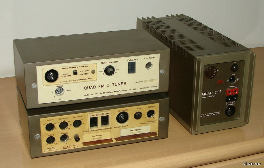 QUAD后级303 线路诡异而耐用,是电流倾注式铭器QUAD405(75年旧版)的前身。因其特性与LS3/5A喇叭十分合拍, 成为LS3/5A当年常见的录音室元配,正是那时BBC常用的QUAD 50,即QUAD 303后级的专业型号。它和LS3/5A最“夹”的地方,是它那40多瓦的功率,推LS3/5A恰到好处,声音宽松平衡自然,且异常耐用, 被众多LS3/5A玩家选用。另,QUAD FM3也颇有名气,音靓而灵敏度很高,和33+303是为完整一套。