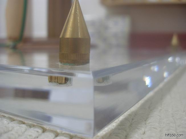 这东西国内叫有机玻璃,常用在工艺品或曰常家居用品中。亚克力有着新时代艺术品位,刚柔并重,晶莹透亮,此东西有着玻璃的通透而没玻璃的硬朗。论到垫放音响器材也算了得,它没一般玻璃光亮,没石块坚硬,没木块柔软,声音自然华丽,饱满而光泽可人。因为朋友送来的那个机架构造磁浮原理,制作比较复杂很难照本复制,只好跟据其含意自己找加工厂做了一个简单的机架。因为小了一层磁浮面听感沒有送来的质感明显,但我的相对起速度感就来得恰当些,看着舒服听着顺畅。在整体听感上还是有板有眼的,现在可安心放在它身上终于找到换下脚钉的理由!小玩意没什么工艺和科学,只仅供参考;大家不妨按器材尺寸制作一个试试!