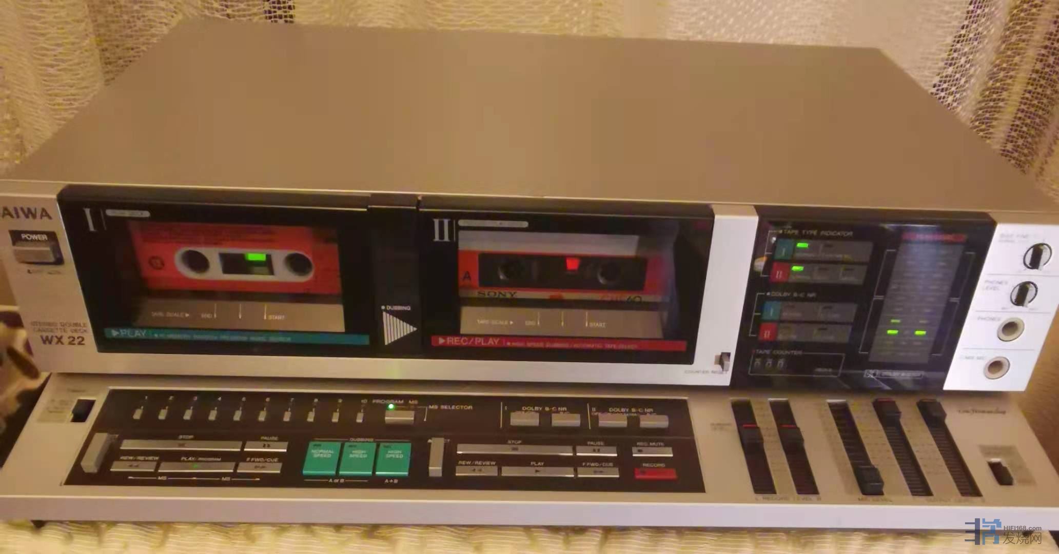 :AIWA AD-WX22双卡盒搭载了丰富的编辑功能。不仅是单面的定速复制和倍速复制,还可以进行A/B两面的同时倍速复制。双面同时倍速复制,A面从头部开始,B面从背部开始,在不更换盒式录音带的情况下,将整个画面加倍复制,C-60录音带15分钟就完成了复制。实际的动作可以根据复制日程选择3种复制风格。可以进行复制时的噪声降低的ON/OFF(仅在匀速时)。此外,还可以调整复制时的级别。搭载了可以按照喜欢的曲序进行复制的程序•自动双速编辑功能。将卡盒I的播放曲顺序自由设定到合计10首,通过按复制键,以指定的曲序开始编辑复制。此功能仅在单面定速/单面倍速时可用。根据卡盒I和II的开始同步的同步复制机构,简化了复制操作。此外,还配备了随机程序选曲线性播放器LX-7用同步端子。搭载了混音器功能,例如在卡盒II录音时可以从卡盒I播放声音效果,用混音器自由淡入/淡出声音。另外,通过连接另一台外部卡座,可以录音自己混合的声音。卡盒II在录音中也可以独立使用卡盒I的独立监视机构。可以用随机选曲功能和音乐中心功能快速的开头。另外,还配备了10首歌曲的记忆选曲机构,可以按喜欢的顺序存储歌曲。在卡盒I再现在卡盒II录音的源,在卡盒II进行混合录音的话可以多重录音。再录头采用了SH头。录音头部采用了即使是大输入,磁饱和也很少的宽间隙型。另外,再生头采用了提高高频特性的低间隙型。机械装置部采用了2个DC伺服电动机和2个DC马达。作为降噪系统搭载了杜比B/C。自动检测磁带类型并自动设置磁带的最佳偏差/均衡器值的自动磁带选择器。另外,为了发挥磁带的性能,搭载了偏压微调整机构。配备了自动重复播放磁带的一面的功能。配备了方便首露和词组的队列和评论功能。搭载了单触自动制作歌曲间空白部分的自动静音功能。搭载了可以同时播放三个阶段的耳机监视器开关。配备有点击点的录音音量。通过组合另售计时器,可以在卡盒I上播放闹钟,在卡盒II上可以进行留守录。