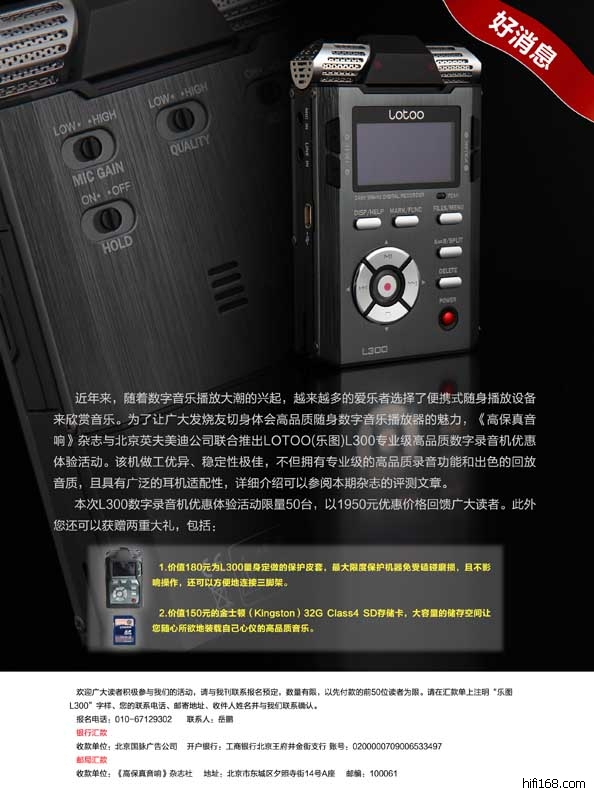 为了让广大发烧友切身体会高品质随身数字音乐播放器的魅力,《高保真音响》杂志与北京英夫美迪公司联合推出LOTOO(乐图)L300专业级高品质数字录音机优惠体验活动。该机做工优异、稳定性极佳,不但拥有专业级的高品质录音功能和出色的回放音质,且具有广泛的耳机适配性,详细介绍可以参阅本期杂志的评测文章。