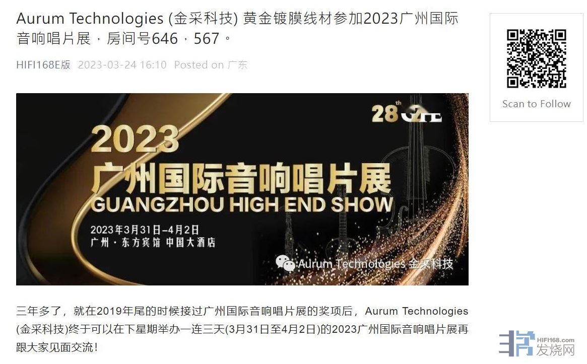 Aurum Technologies (金采科技) 黄金镀膜线材協同美国Sound Lab参加2023广州国际音响唱片展,房间号567,646。https://mp.weixin.qq.com/s/B1lHbYDNK7EKZM4Db1ogKQ HIFI168E版 2023-03-24 16:10 Posted on 广东三年多了,我们终于可以在下星期广州国际音响唱片展再跟大家见面交流!show e2023.jpg(127.58 K)2023/3/27 9:58:50三年多了,就在2019年尾的时候接过广州国际音响唱片展的奖项后,我们终于可以在下星期举办一连三天(3月31日至4月2日)的2023广州国际音响唱片展再跟大家见面交流!2019年尾广州国际音响唱片展的奖项.jpg(227.37 K)2023/3/27 9:58:50今年我们会协同美国Sound Lab代理李先生于646及567号房出展,为大家展示Sound Lab (天域) 屏风音箱、Atma-Sphere (大气层) 产品以及我们Aurum Technologies黄金镀膜线材的非凡魅力。2021 hifi show.jpg(265.92 K)2023/3/27 9:58:50Sound Lab2.jpg(221.13 K)2023/3/27 9:58:50Sound Lab (天域) 屏风音箱、Atma-Sphere (大气层) 产品详情: https://hivilord.taobao.com/2021 hifi show2.jpg(260.55 K)2023/3/27 9:58:50Sound Lab (天域) 音箱E版的三支並聯紫金天籟 Aurum Purpura Celestial 3G.jpg(256.64 K)2023/3/27 9:58:50E版的三支並聯紫金天籟 (Aurum Purpura Celestial 3G) 亦会从他家中借来在展房为大家演示AQ程大哥于金采工作室交流,手上就是为他演示的紫金天籟E版的三支並聯紫金天籟 2.jpg(250.37 K)2023/3/27 9:58:50Atmos-phere MA-1.jpg(55.11 K)2023/3/27 9:58:50Atmos-phere (大气层) MP-3