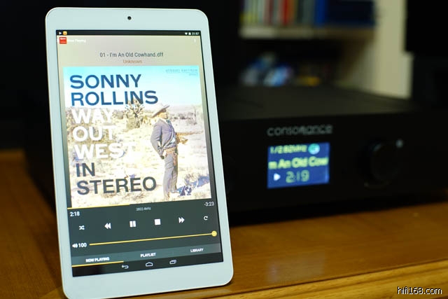 ONDA的8寸PAD,虽不甚高级,但作为遥控器还是很过瘾的,安卓版的遥控软件是BubbleuPnP,全英文界面对我是无压力的,开播后巨大的《WAY OUT WEST》唱片封面非常抢眼,仔细看界面还有码率显示,2822kHz-轻度强迫症患者非常喜欢这个码率显示功能!