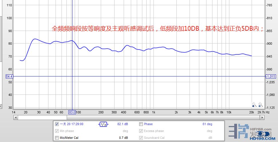 XTZ声学仪所测全频段频响,全频段基本正负5DB内(按等响度及主观听感调试低频约增加10DB);