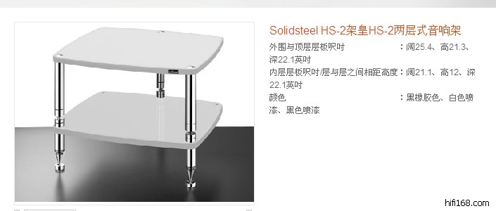 意大利SOLIDSTEEL,国内誉为:架王/架皇,性能效果超群,数今天市场上可以用钱买得到的厂制音响架,以来自意大利的Solidsteel最受欢迎,毋论是身边的发烧朋党以至历年曾走访过的音响发烧友,超过一半以上是采用Solidsteel出品的音响架来承放器材。Solidsteel的音响架之所以如此受欢迎,无他,是全赖它的造工精美、价钱合理以及调震、化震、避震性能出色,用它承放器材,全频的透明度不但全面提升,且低频的控制力与两极的延伸力亦见有可闻性的改善。而更重要的是,它并不存在强烈的签名式音色,令器材安放其上後不致出现涂鸦式的音染,以价论成效,我仍认为它是当今之最,若要更上一层楼,得须付出倍数以上的金钱不可。