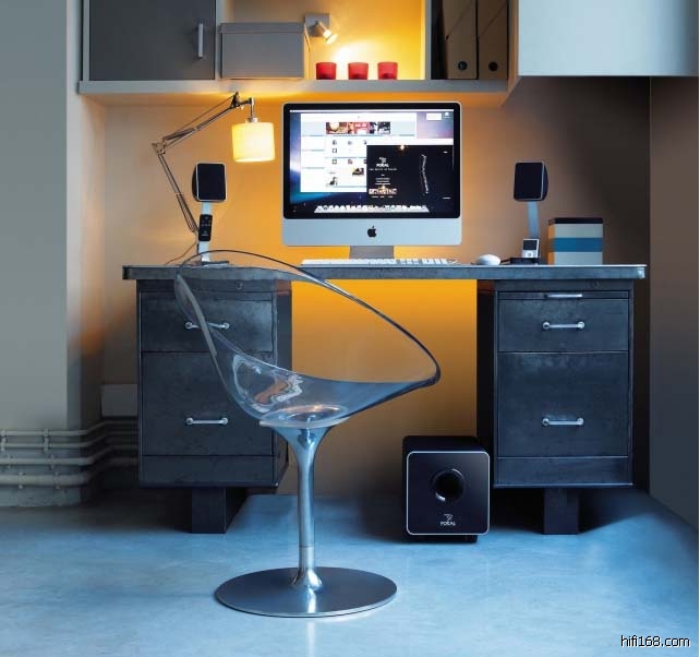 左圖:造型優美的Focal XS 2.1系統與iMac電腦擺在一起十分登對,外觀為「噴射機黑」(Jet Black)與電鍍鋁雙色組合,衛星喇叭金屬腳架彎曲的弧度與造型甚至與iMac螢幕幾乎一致,但Focal XS這衛星喇叭可不光是外表好看而已,除了單體及音箱架構本於Focal一貫的高品質外,更配備了稱為「視覺與音效一致」(Visual and Sound Coincidence, VSC®)的技術,利用桌面與螢幕表面的反射,無論聆聽音樂或觀看影片,都能讓聲音的結像與定位更精準。