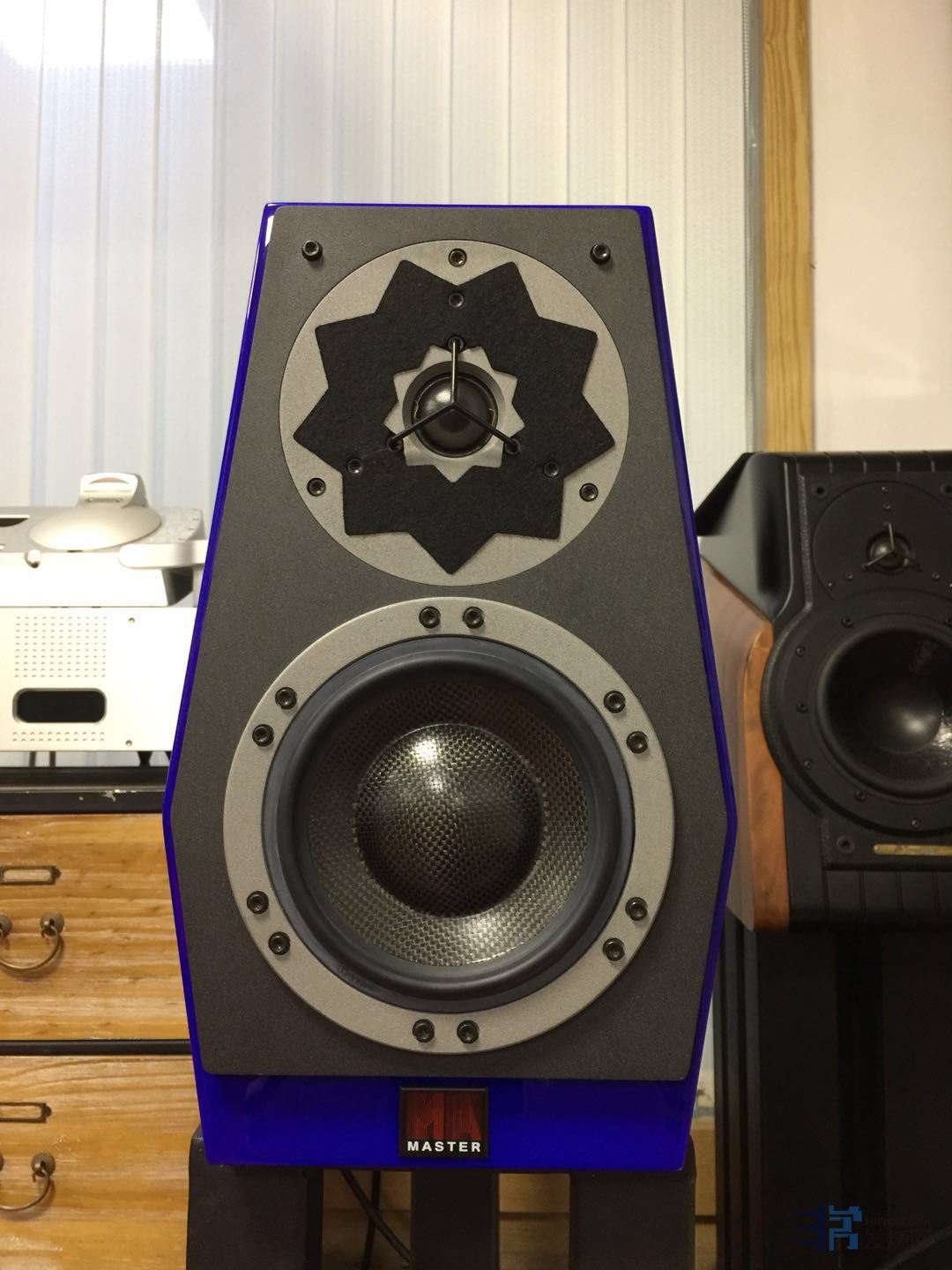 最新版的监听一号采用了三明治的碳纤维单元,这个单元不是大家所想的某厂牌采购,而是美之声自己研发生产的;碳纤维单元作为当今最优秀的振膜物料之一,已经被魔域、艾格斯顿、卡玛等一线HI-END品牌所采用,原因当然是轻盈与刚性具备的物理特性;而高音采用绅士宝Scan-speak的9900高音。应该从单元上讲配置是很高的。