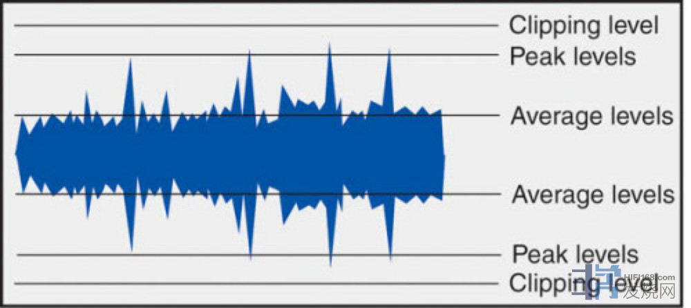 图中Average levels就是平均的音乐讯号,但音乐是动态进行的,若有诸如打击乐器演奏时就会出现如Peak levels就是音乐的峰值讯号,会比平均音乐讯号高出很多。
