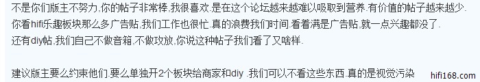 原帖由 zjize 于 2016/4/15 10:08:00 发表很久没有怎么上168了,刚一上来让人很不适应,确实广告也过多了些,支持E版和168对广告进行管理。尤其是对于故意的炒作,如注册马甲相互吹棒,无意义的顶贴这类行为,应该明令禁止。另外,通过认证商家的方式,允许商量发布产品信息。但是,还是应该要求商家回避自已产品或与自己产品相产的产品的优劣讨论(但应该允许商家进行解释或说明);更要禁止注册马甲吹棒自己产品,黑其它产品,与用户争辨等;虽然目前论坛