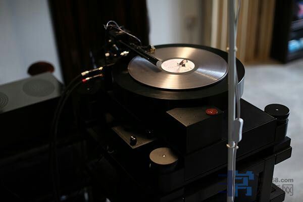 转盘部分:采用了主副盘结构,主盘直径达到400MM,厚度60MM,带来了极高的转动惯量,从而使得转动的平稳性得到很大的提升!通过转速仪可以看到:落针后转速不受任何影响!这一点看似简单但实际上很多盘是做不到的!副盘采用了60MM厚直径300MM的气浮盘,改良型的气浮轴承!