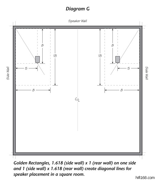 今年56月份仔细读cardas的room setup,他提出的diagram G(见图)方案就是运用费比尼西系数来摆位,我尝试变通一下,就发现在效果非常好,一直就没动过了喇叭摆位了。