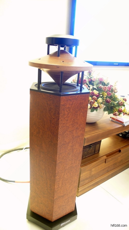 德国Duevel“帝风”是一个很特别的牌子,造型特别,声音也特别,并不管市场的接受度,一直坚持它的风格。这个牌子目前只有4个型号的音箱,“维纳斯”排行老三。一个木制六角形的箱体,上面顶着一个飞碟状的木圆锥体,这个圆锥体的上下端都收成尖锥,上面的尖对准更上面的、面朝下的高音喇叭,下面的尖对准置于六角箱体上端、面朝上的低音喇叭。这种设计的第一个好处是消除了因喇叭指向性导致的音场容易浑浊的问题,更接近“点声源”的概念,使声音清纯;第二个好处是造成了360°的发声方式,这样可以收到十分宽松的音场和色彩丰富的表情;第三个好处是低音独立箱室,一点也干扰不到高音喇叭的工作,这也能让声音干净;还有一个好处,低音箱体很大,可以生成庞大的低频能量。