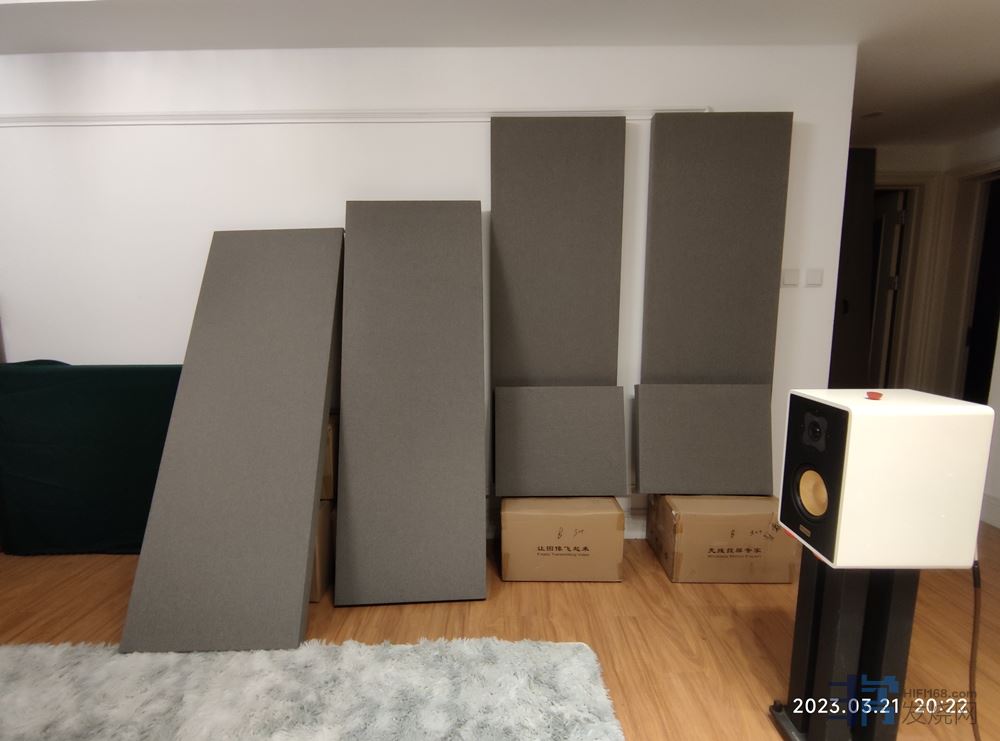 当然,如果只这样,肯定是要玩完的。专业设备要上才行,于是买了四块0.6*1.2*0.07米的扩散板,两块放音箱背后,两块放侧墙第一反射点。现在看来,第一反射点应该是装吸音板才对。后面考虑拆掉重新装,要么是天花板上,要么是音箱后面。
