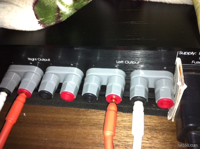 经过多位的发烧好 友 的 提 议 ,重 新 对 音 箱 进 行 摆 位 ,原 来 音 箱 与 后 墙 只 有 40 cm的距 离 拉 开 到 80cm,然 后 对 功 放 后 面 的 音 箱 接 线 进 行 检 查 ,结 果 发 现 了 意 想 不 到 的 东 西 ,见 图 :
