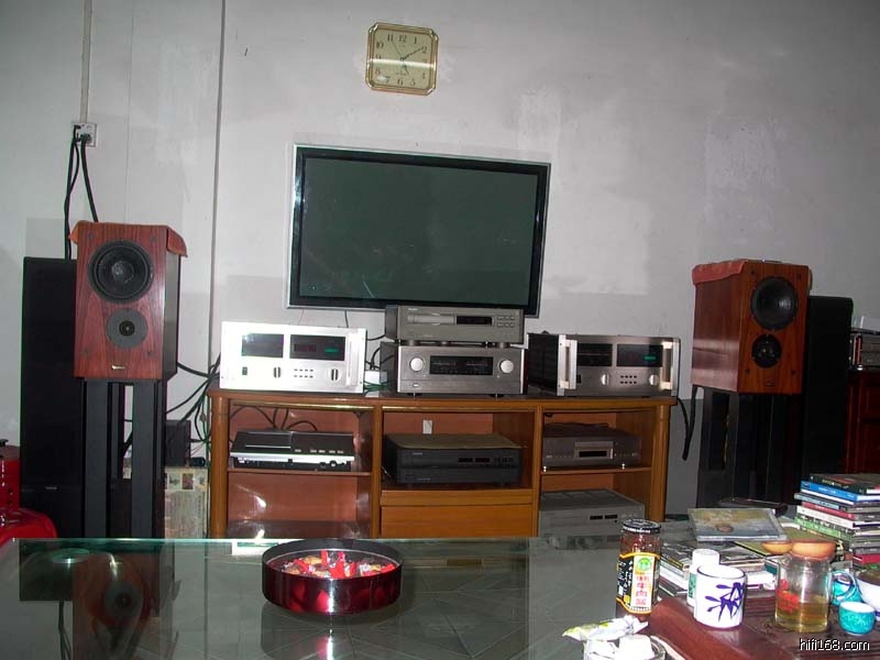 这位仁兄没有专门的听音室,只能在客厅里,器材的上方是一台国货等离子电视,试听时的器材如下:音箱:皇冠/达雅,后级:金嗓子/M100,前级:暂用金嗓子/E405合并机的前级,音源:飞机/500R,信号线及音箱线忘记记下了。。。。。。