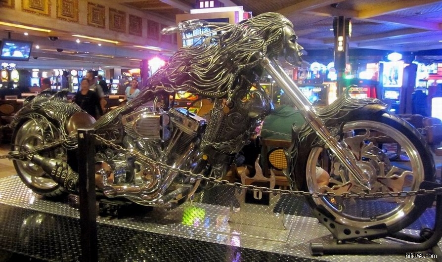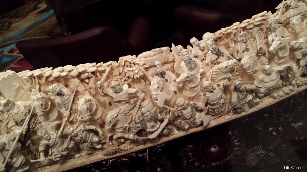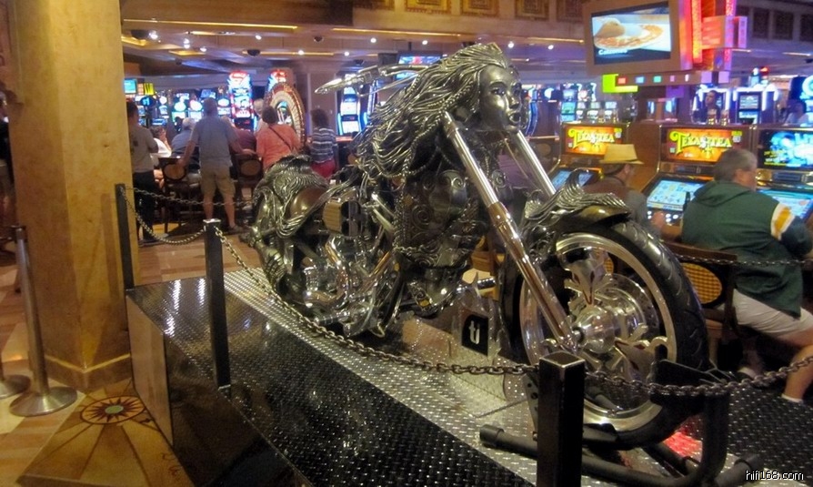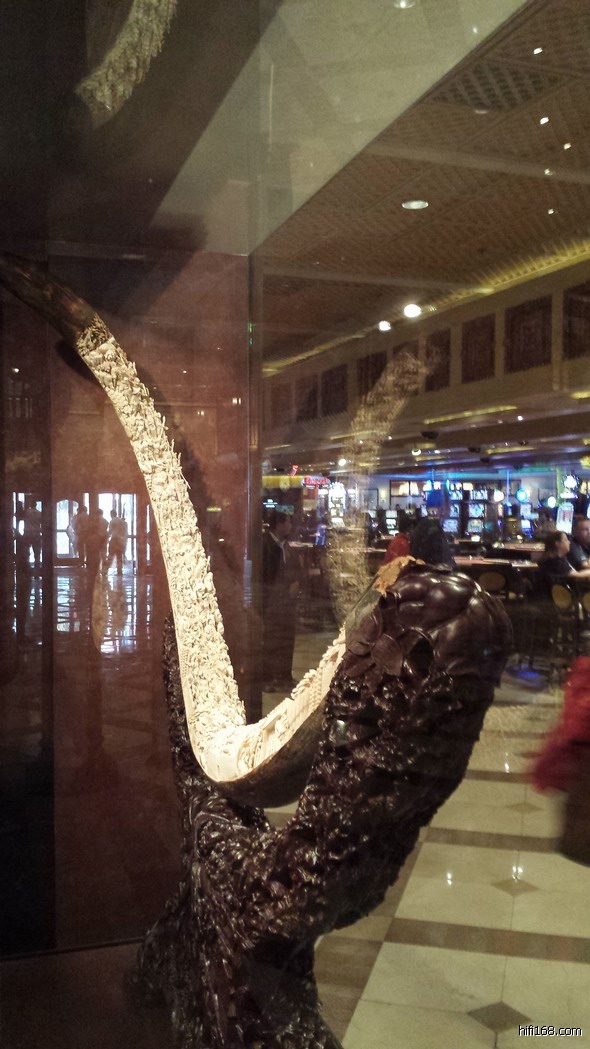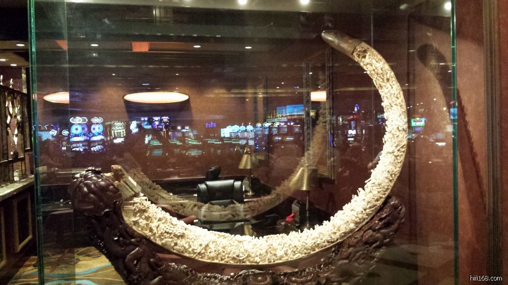 )”,见酒店一楼的赌场置立二件“镇店之宝”——全手工锻造的哈雷摩托车和象牙雕。其中那件象牙雕还是我国清代的艺术佳作,特拍下来与众烧友分享: