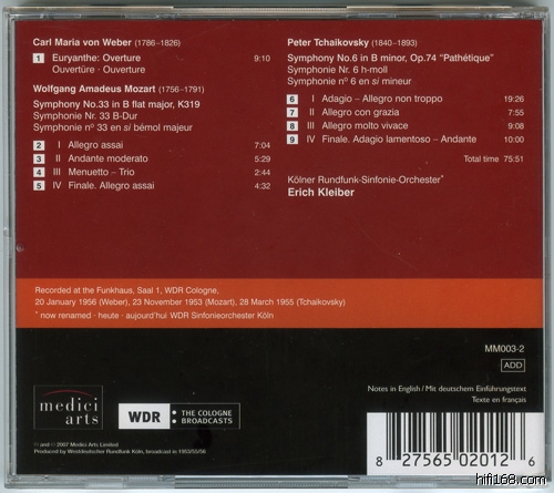 1956年1月E.Kleiber进行了最后的科隆之旅,他跟Birgit Nilsson(1918-2005)合作的Beethoven Fidelio成为他最后的公开演出,1月20日他进行了一次广播录音,包括Weber Euryanthe序曲、Weber第1号交响曲(Decca和Preiser都有),另外还包括Mozart的单簧管协奏曲、NO,39和几首德国舞曲。当中只有Weber Euryanthe序曲出现在本CD,Mozart都可以在Medici Masters MM011-2中找到。