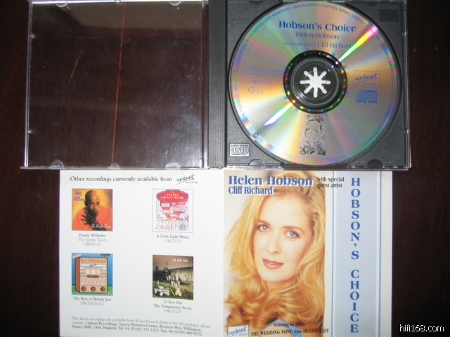 订这张HOBSON‘S CHOICE的时候是冲着CLIFF RICHARD去的。拿到唱片之后发觉唱片上的人非常眼熟,翻看资料发现今年在上海演出的音乐剧《Mamma Mia》在2006年4月英国伦敦的演出,其中的女主角Donna Sheridan就是由她来演的。看介绍说HOBSON是英国著名的歌舞剧演员,演过Aspects of love 的Rose,Grizabella,My Fair Lady的Eliza,96年10月还和Cliff一起演了一部音乐剧Heathcliff,演的那个角色叫Cathy。为我们最熟悉的《指环王三部曲》中‘Gollum’s Song’ and ‘Into The West’也是她唱的。在这张专辑中最好听的就是与CLIFF合唱的IF EVER I WOULD LEAVE YOU(如果我会离开你)。这张唱片绝大多数曲目都来自歌舞剧中的选段,所以就取名为HOBSON的选择。而且UPBEAT RECORDINGS公司也是英国的一家出色的唱片公司,此公司出品的唱片录音绝对有保证。