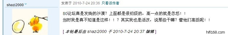 http://bbs.hifi168.com/showtopic-183660.aspx不就一个被封的问题吗?你就没半点问题?有必要为了这个问题JJYY的吗?不要忘记了,你是男人,不要为了这种事而在发泄你心中的不满。