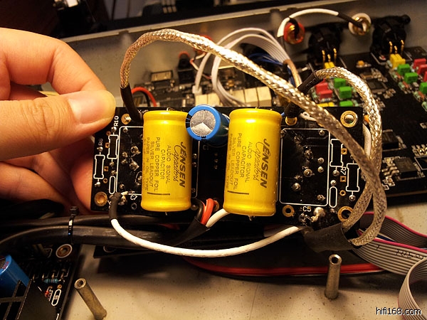 四个电容分别是两个1uF和0.1uF,于是买了4个最低档次的JENSEN铜箔铝管装上。0.1uF可以装在原电路板下面,但1uF就太大了,好在机箱空间还是够的。
