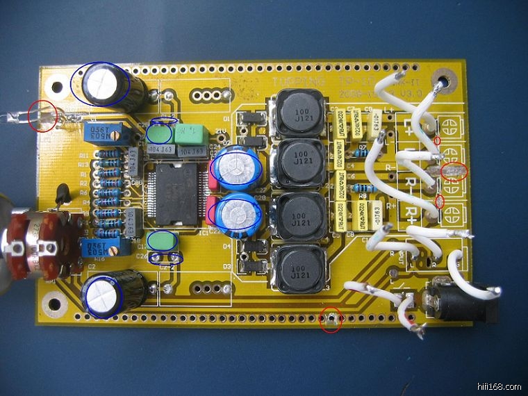 我这个是“山寨版”拓品MK2,参照老浦东方法对地线做了一些改动,下面标红色的地方切断,标绿色的是做了一些调整更换了元件。改动后声音比没有改动前的稍微好听一点。手里没有老浦东的那种4脚电感,又不想把1、3焊到电路板背面以至无法装回机箱,打算暂时就这样先听了。