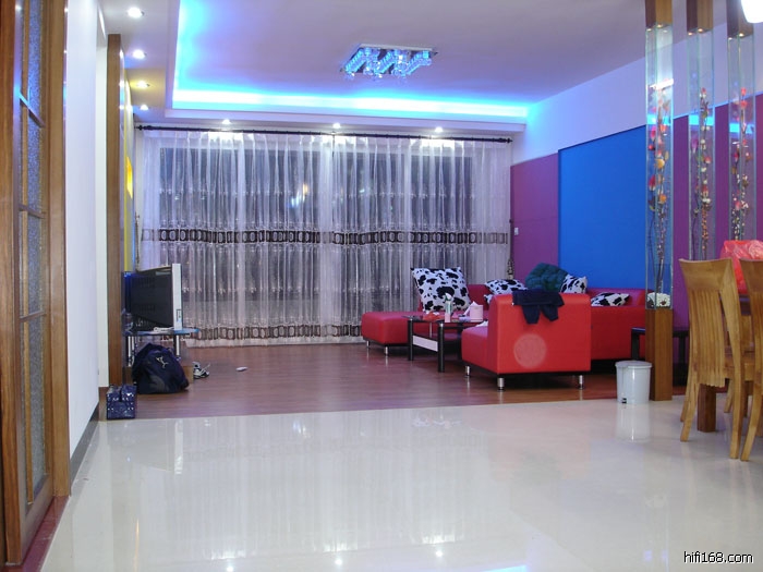 给我家用型装修的几张图示作参考,我这个不是用来听音乐的,所以没按照听音环境处理,但试摆器材听过了,效果还是可以的,我这个厅宽4.6米,长10米.是连着饭厅,总46平方.前墙做了艺术墙,后墙也做艺术墙,但简单一点.地板我大厅隔开用做两种材料,瓷砖和木地板.