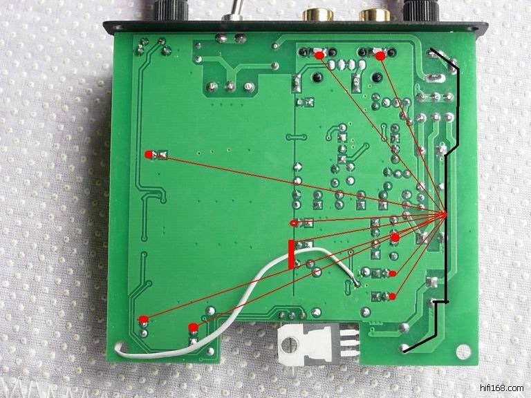 在3个大电解之间区域作为中心点,向那些小红点的焊点拉10条地线,注意都要“戴套”,不得短路。