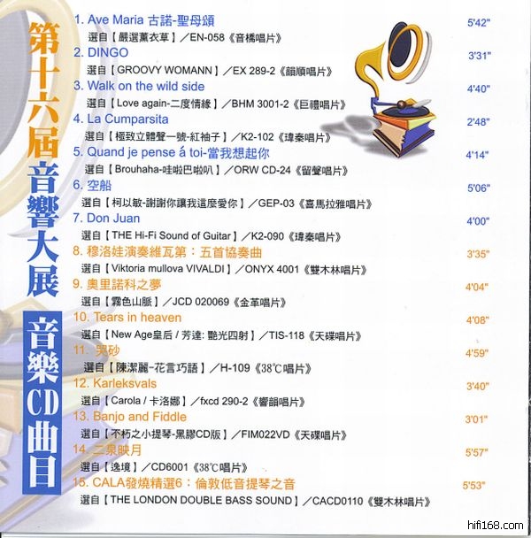 《TAA臺灣第十六屆國際HI-END HI-FI音響展CD》精選了15首包括古典、人聲、爵