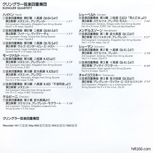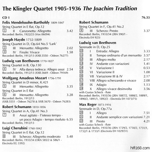 大约在1998年,日本新星堂和英国Testament在策划着把Klingler SQ.的录音初CD化,新星堂大约是由于等待庞大的德奥组全套计划完成而落了后,他们发行时间是1999年3月21日,而Testament则是1998已经发行,两者的曲目并不完全重叠。在德奥体系中,把四重奏艺术发扬广大的Busch SQ.大家都不陌生,但是作为继承传统重要一环的Klingler SQ.则相当程度地被人遗忘,CD发行的情况可以说是相当地悲惨,除开新星堂和大T,本人还真是找不出别的发行了!